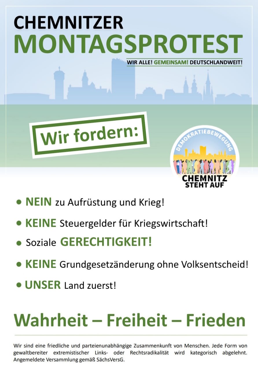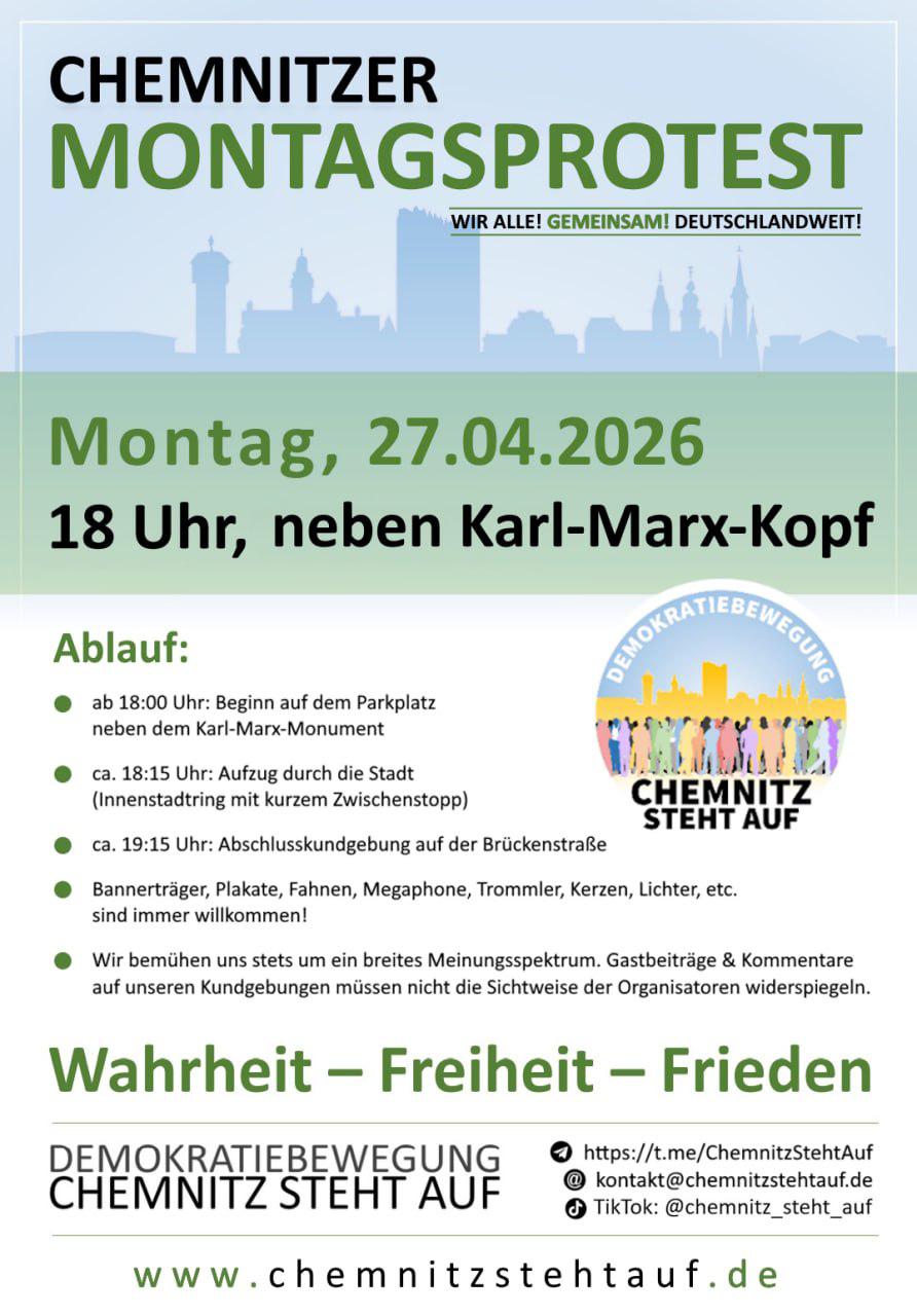 .Chemnitzer Montagsprotest - 18.00 Uhr, Parkplatz Brückenstraße danach Aufzug durch die Stadt